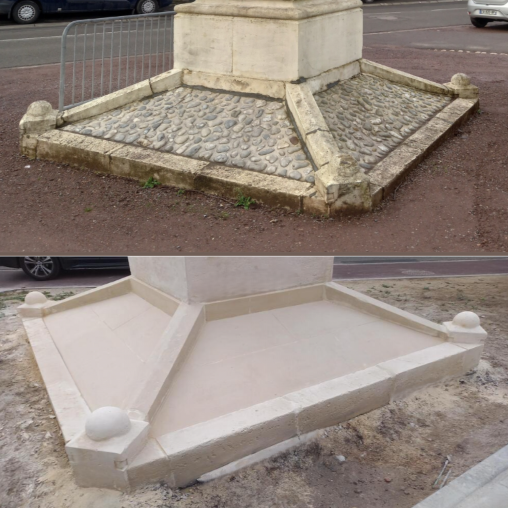 Une nouvelle base a été maçonnée en pierre calcaire, avec des éléments taillés sur mesure, afin de retrouver une assise saine, durable et cohérente avec l’ouvrage.